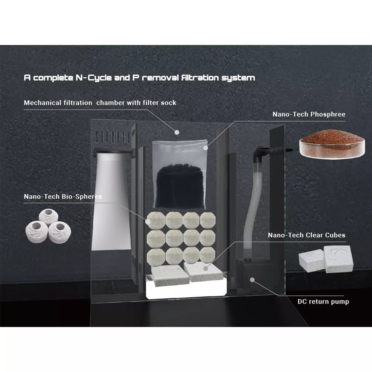 W zestawie z Dice Cube AIO znajduje się zestaw startowy mechanicznych, biologicznych i chemicznych mediów filtracyjnych. Nano-Tech PhosPhree to żywica pochłaniająca fosforany, która powoli redukuje PO4, zapobiegając nagłym spadkom, które mogą wstrząsnąć twoim systemem. Nano-Tech Clear Cube to unikalne media jonowe na bazie turmalinu krystalicznego, który pomaga klarować wodę w akwarium i zwalczać wzrost glonów poprzez rozkładanie rozpuszczonej materii organicznej. W zestawie znajduje się również 12 sztuk kul Nano-Tech Biosphere do wspomagania wzrostu pożytecznych bakterii oraz jedna nylonowa skarpeta filtrująca do wychwytywania i filtrowania organicznych ciał stałych.
