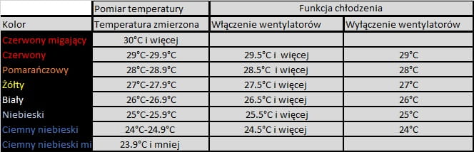 Lewa dioda LED prezentuje za pomocą kolorów, poziom zmierzonej temperatury zgodnie ze skalą naniesioną na obudowie urządzenia.