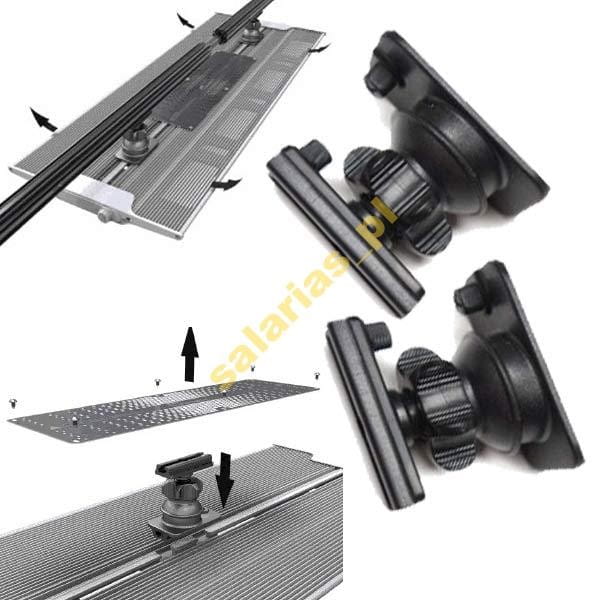 W celu zamontowania mocowań przegubowych należy odkręcić śruby blaszki z górnej części lampy(lewy dolny róg zdjęcia) pod którą znajduje się szyna umożliwiająca osadzenie 2 mocowań. Należy je wsunąć w obie prowadnice i na sztywno przymocować dokręcając śrubę przy pomocy palców (nie używać śrubokręta).